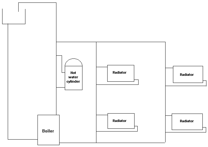 This is my own rough sketch of a traditional gravity system. It's the same as an old coal fired system but with a gas boiler inserted in place of the original coal boiler in the kitchen. There is no pump (obviously), and the whole thing is installed using huge diameter pipes because the only motive force for circulation is natural convection. Hot water is less dense than cold causing it to rise to the top of the system. Water inside the rads cools as it gives up it's heat to warm the house and falls to the bottom of the system where is is re-heated by the boiler and rises to the top again. Old unmodified gravity systems are usually direct, which means the water from the hot taps and hot water cylinder is the same water that is circulating through the radiators. There is no separate header tank and heating coil inside the HWC as in modern systems.