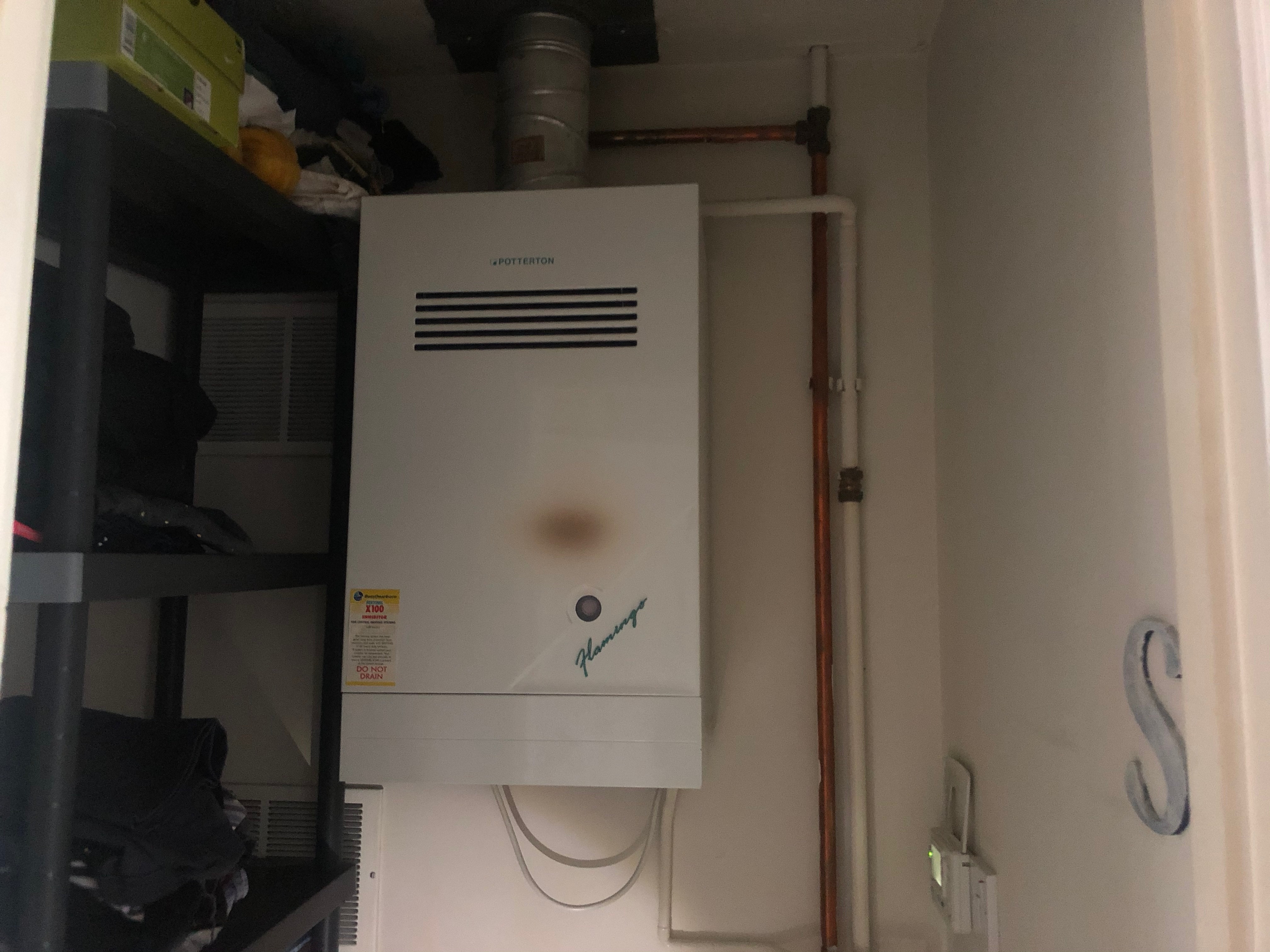 Potterton Flamingo, an open flue version. Note the slots in the front for ventilation of the flue. Note also the heat stain on the casing. This is unusual and the result of a mis-placed seal inside this particular boiler, now repaired.
