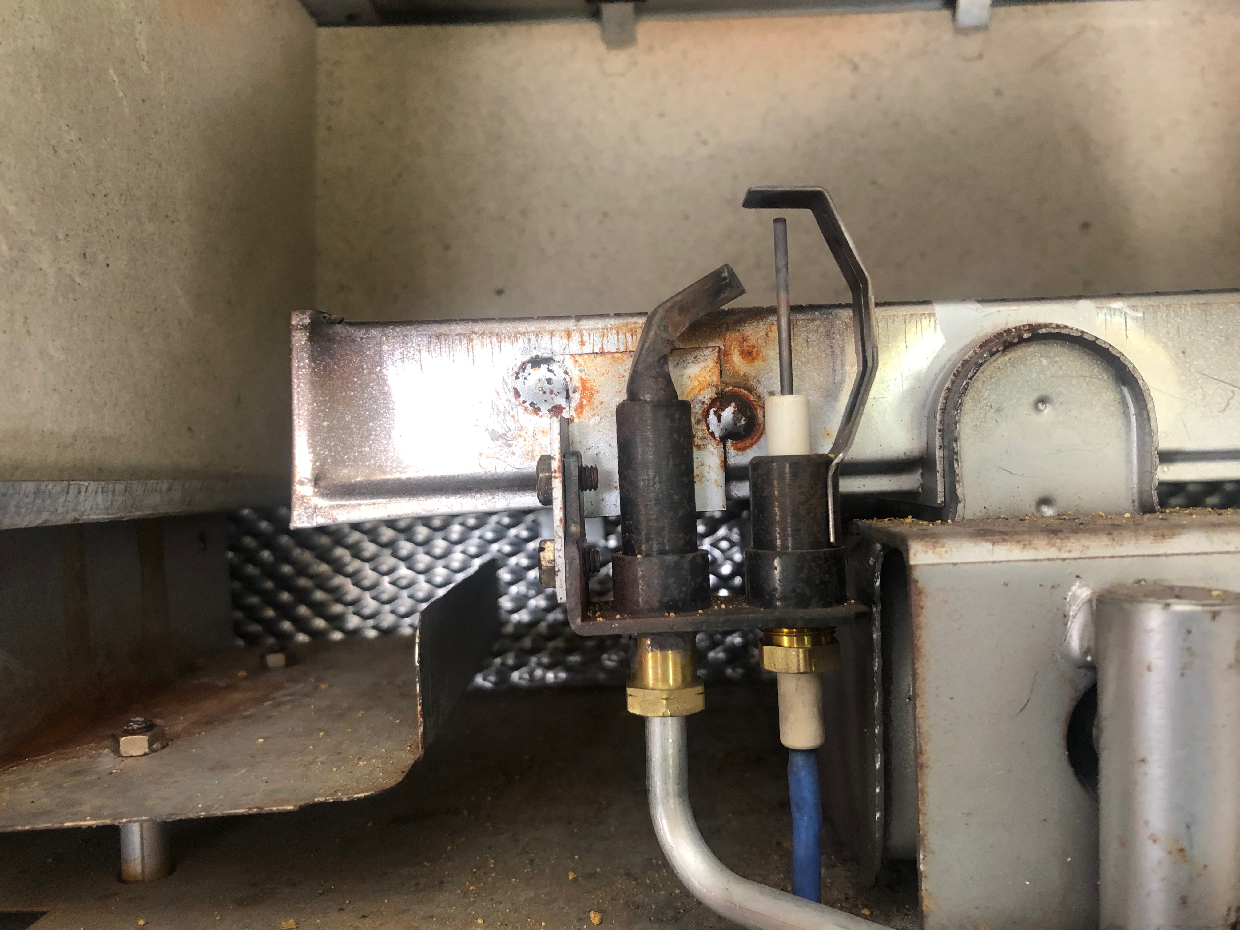 4) The pilot flame lights. Quite a lot happens here. The control board detects the fan is running, it opens the pilot channel on the gas control valve which feeds gas to the pilot light assembly, and it delivers a stream of sparks to light the pilot gas. Whilst delivering the sparks it looks for the presence of the lit gas flame in the spark gap using a process called ‘flame rectification’, and when it detects that the pilot flame is alight and burning, it stops the spark.