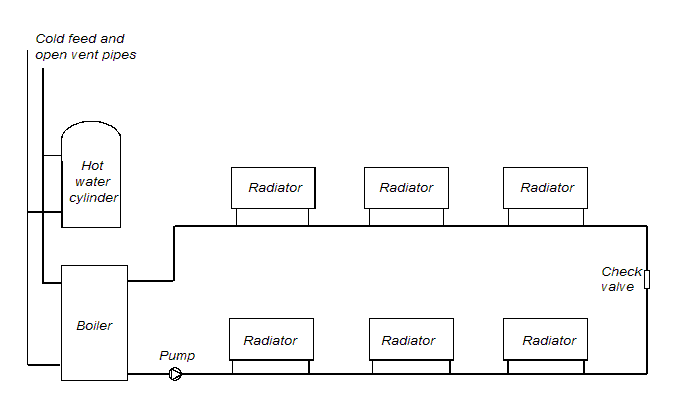 This is a diagram of the obsolete one-pipe pumped system. There are a few systems like this remaining in use but generally they are approaching 50 years of age or fitted by a DIY installer with a very old book of how to fit central heating.