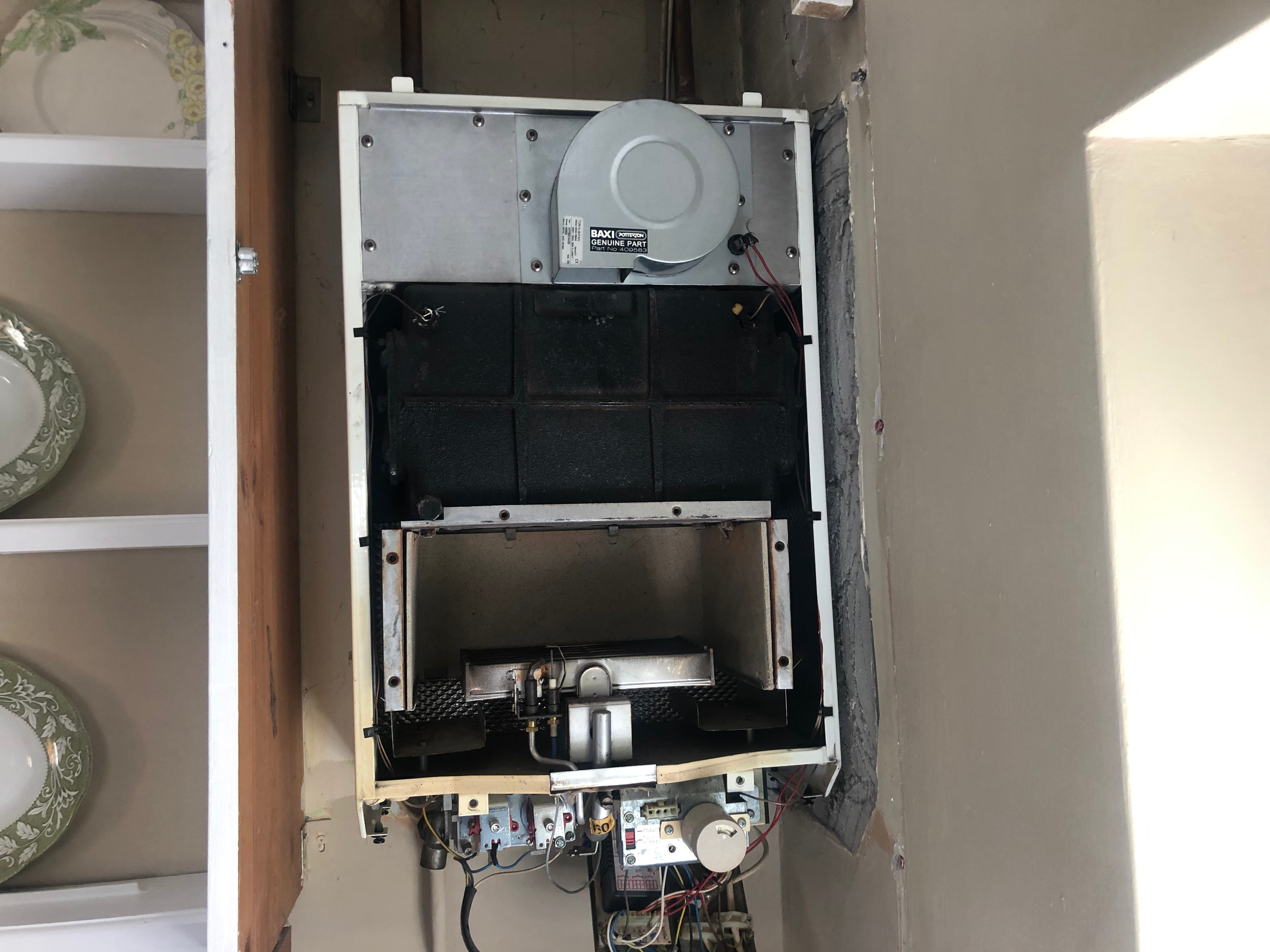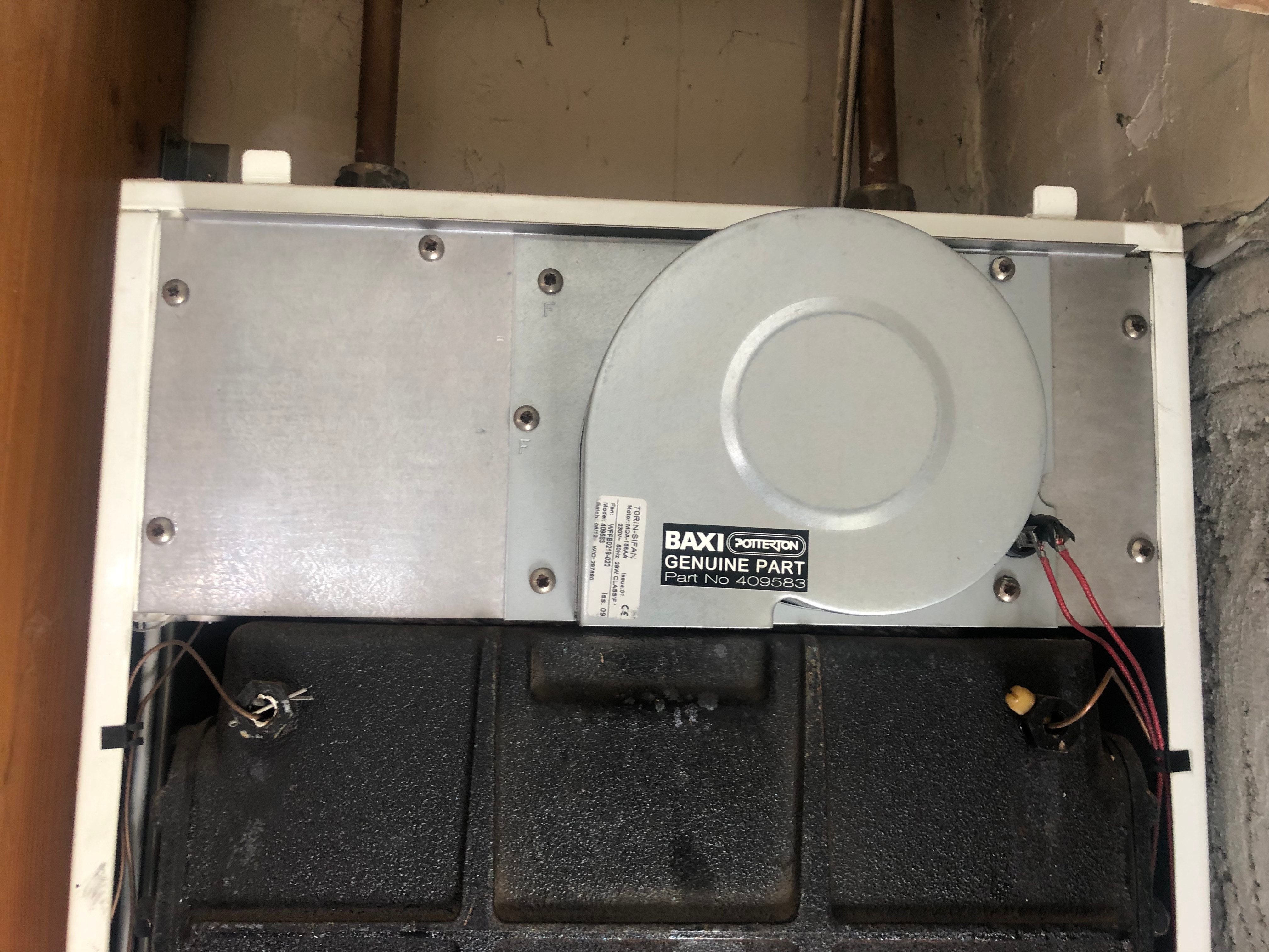 Here is the boiler with the front removed showing the heat exchanger, the fan and the gas control valve etc at the base.